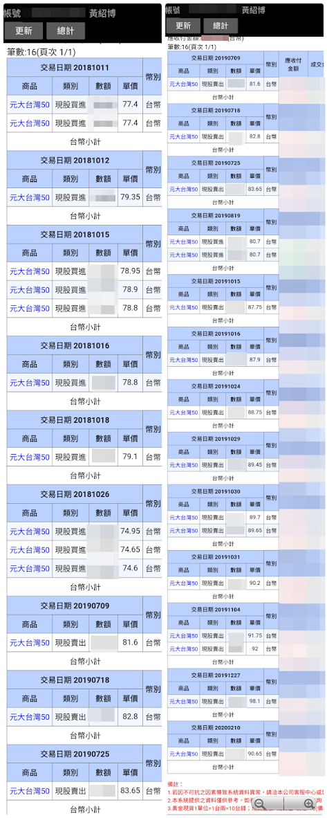 拿出過去的交易紀錄,只是要說明我一直都有買0050,不是現在隨便講講而已。0050不管是波段操作還是定期定額,都有很多好處,你就算不波段交易,假設你跟我一樣從2018年80多元或更早進場,雖然經過武肺崩盤,抱到現在沒有操作也漲到了140元,獲利很棒啊。但是每次我推薦0050,很多人都以為我在開玩笑。